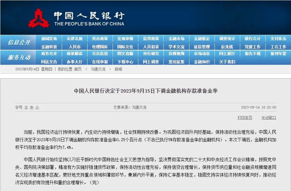 9月14日晚间,央行宣布,为巩固经济回升向好基础,保持流动性合 理充裕,决定于2023年9月15日下调金融机构存款准备金率0.25个百分点(不含已执行5%存款准备金率的金融机构)。本次下调后,金融机构加权平均存款准备金率约为7.4%。
