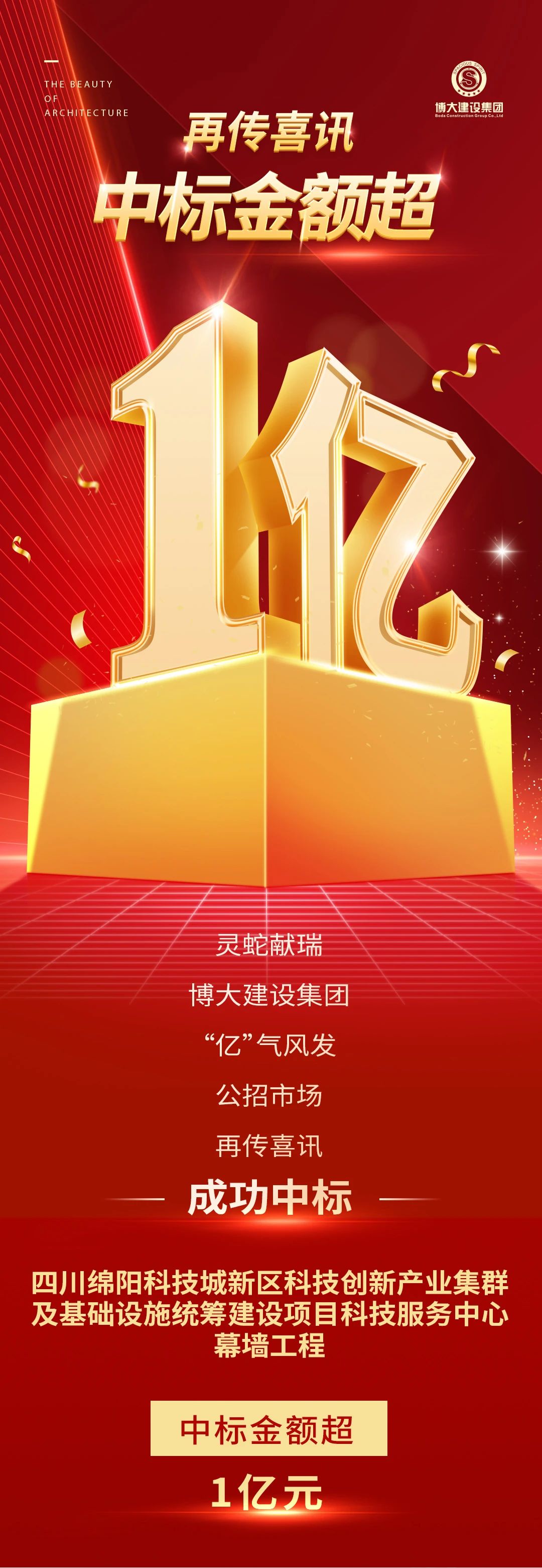在建筑装饰行业竞争日益激烈的今天,博大建设集团凭借自身的实力和优势,不断开拓市场,屡创佳绩。此次中标四川绵阳科技城科技服务中心幕墙工程,是公司发展历程中又一个重要里程碑,未来,博大建设集团将继续秉持高品质的施工理念,为城市建设带来更多的优质项目,书写更加辉煌的篇章。