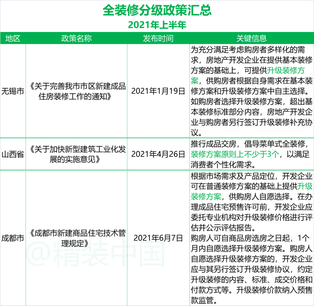 2021年上半年,全国各地区发布了近30条全装修政策。