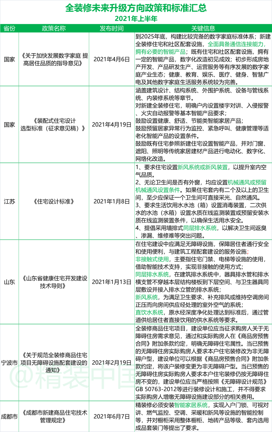 上半年,一些标准、政策出台,代表了未来全装修住宅升级的方向: