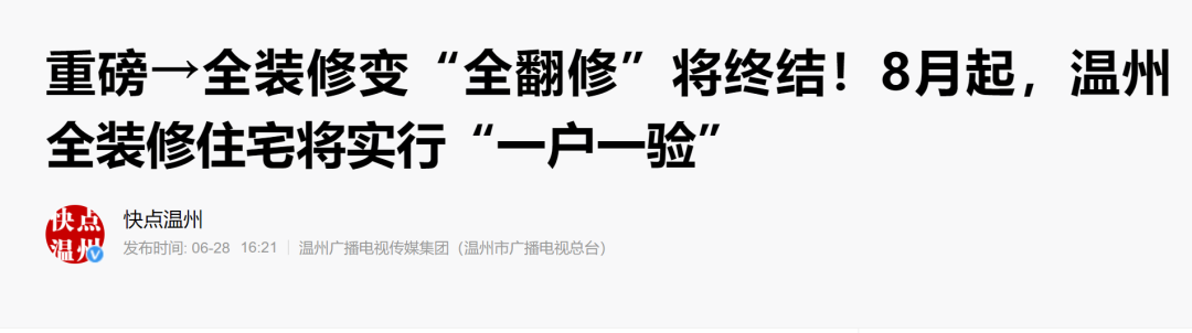 这就是“分户检”,也就是“一户一验”。政策一出,媒体打出了【全装修变“全翻修”将终结!】的口号。究竟能不能遏制二次浪费,有待时间的考验。
